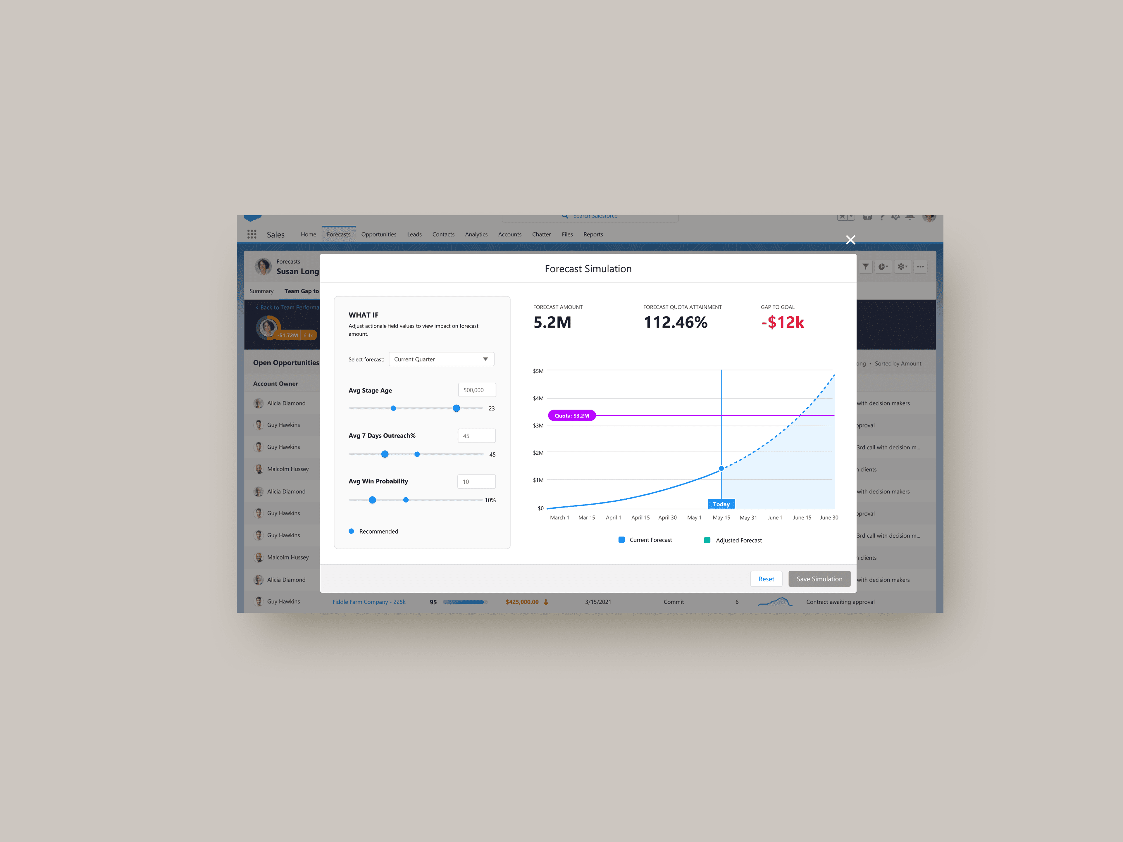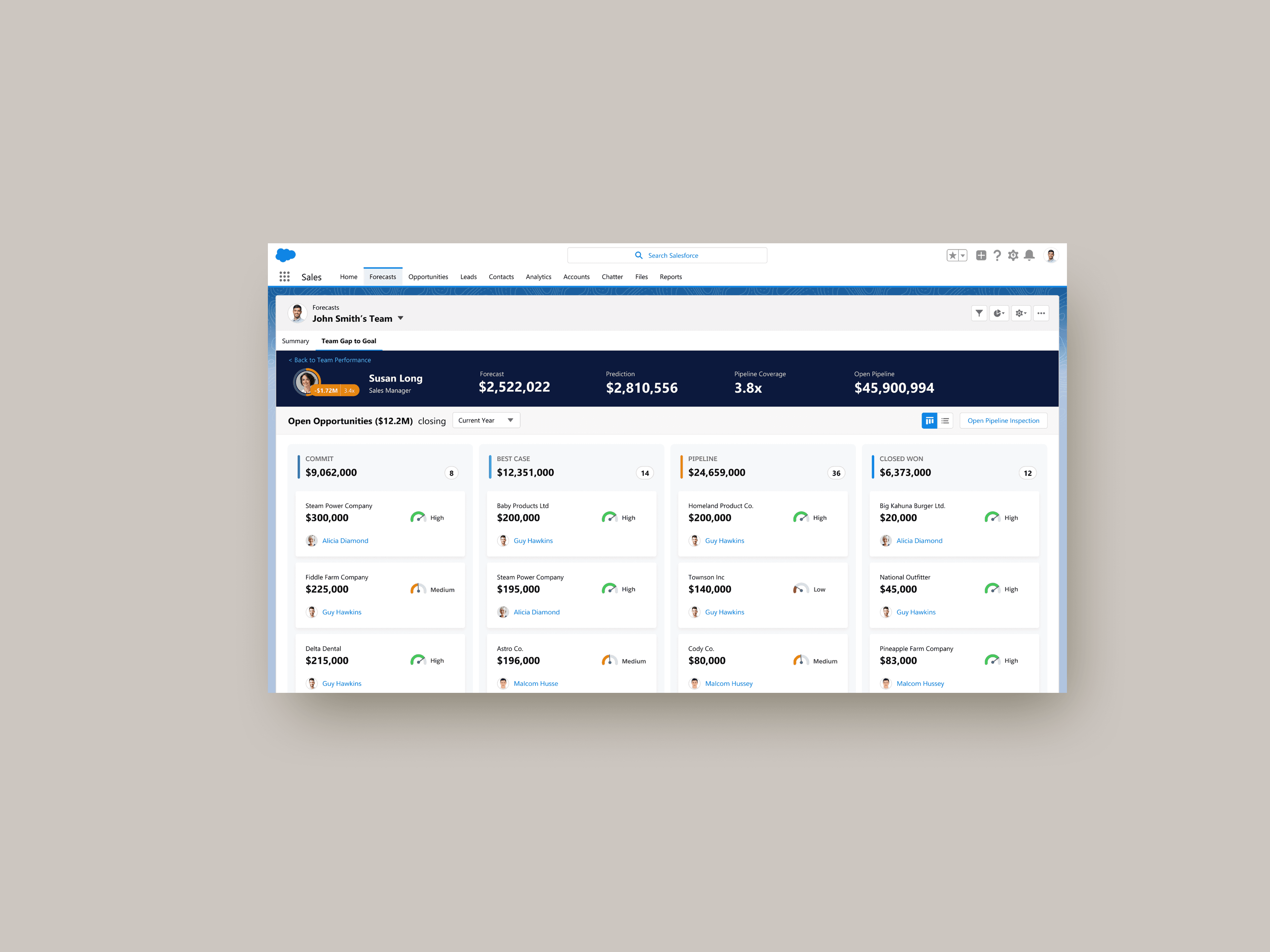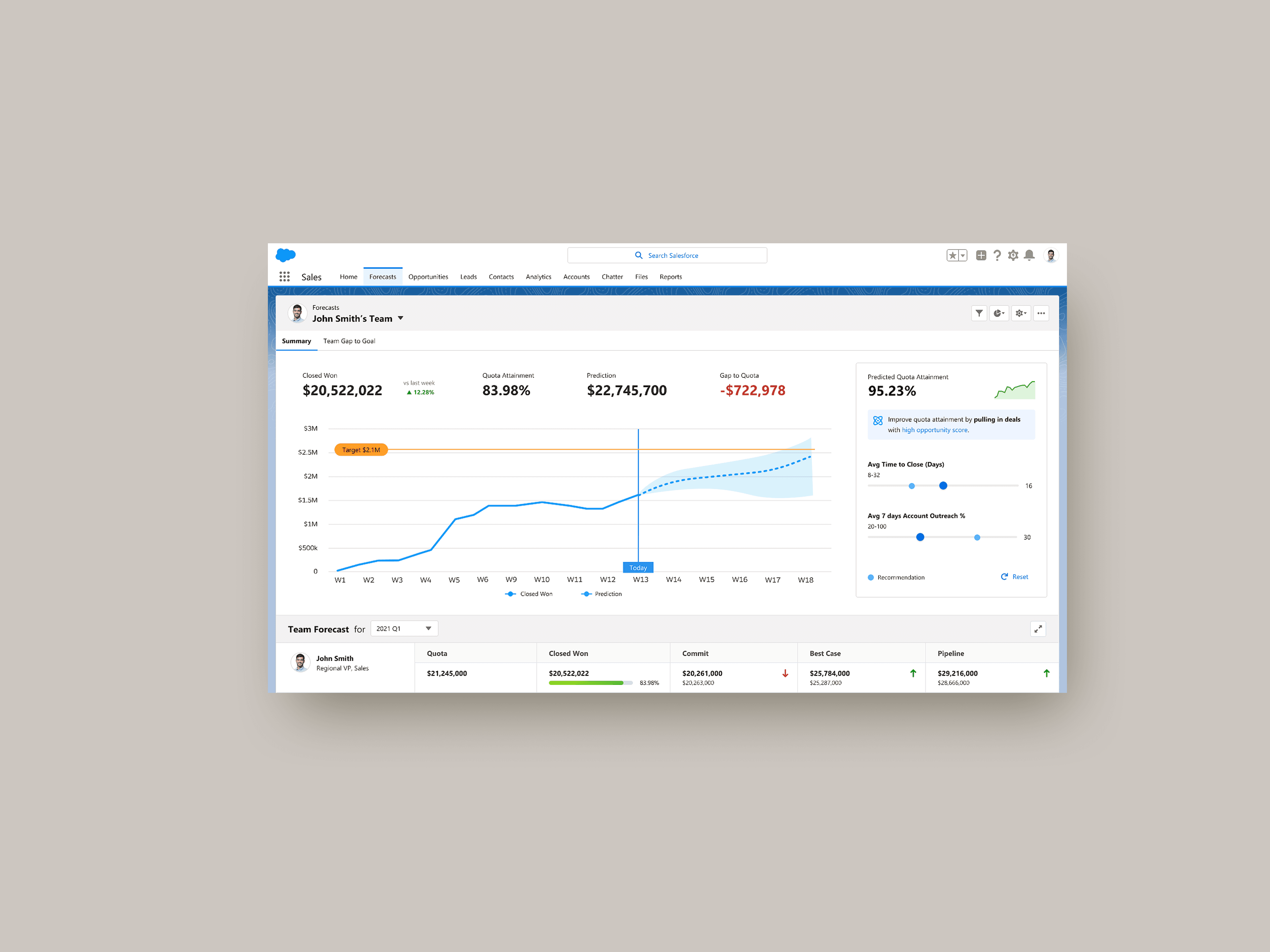 AI sales analytics capbilities are key needs to sales manager users. As a sales manager, it is important to know questions such as "what is the confidence level if my team will meet the quota" "How much should I commit" "Do we have enough deals in pipeline". The key challenge is to provide a realtime AI sales forecasting solution to improve time to idenifty tasks and access forecasting #.